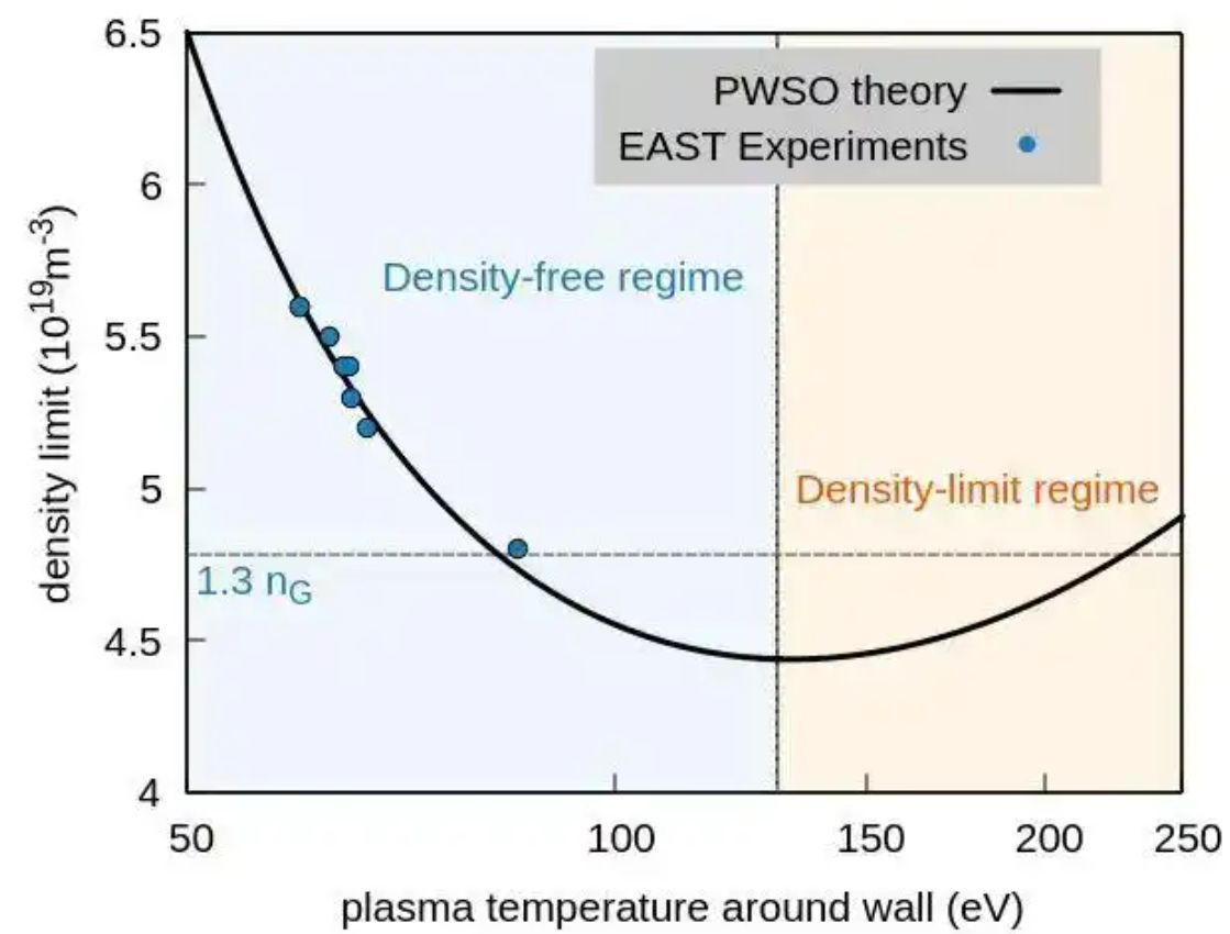 此次,我国科研团队发展了边界等离子体与壁相互作用自组织(PWSO)理论模型,发现边界杂质引起的辐射不稳定性在密度极限触发中的关键作用,揭示了密度极限的触发机理。依托EAST全金属壁运行环境,科研人员利用电子回旋共振加热和预充气协同启动等方法降低边界杂质溅射,主动延迟了密度极限和等离子体破裂的发生。通过调控靶板的物理条件,降低了靶板钨杂质主导的物理溅射,控制等离子体突破了密度极限,引导等离子体进入新的密度自由区。实验结果与PWSO理论预测高度吻合,首次证实了托卡马克密度自由区的存在。这一创新性工作为理解密度极限提供了重要线索,并为托卡马克高密度运行提供了重要的物理依据。